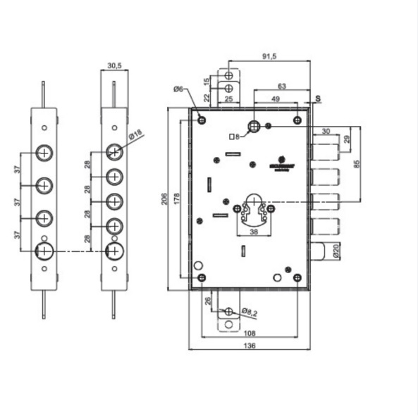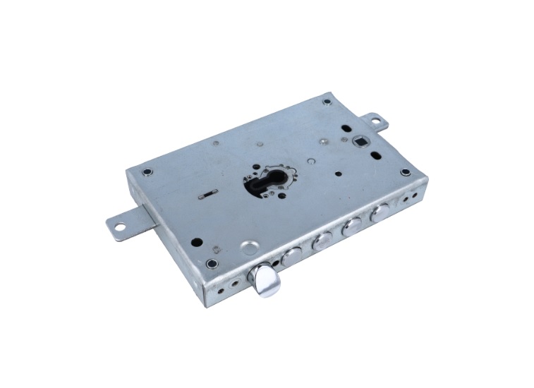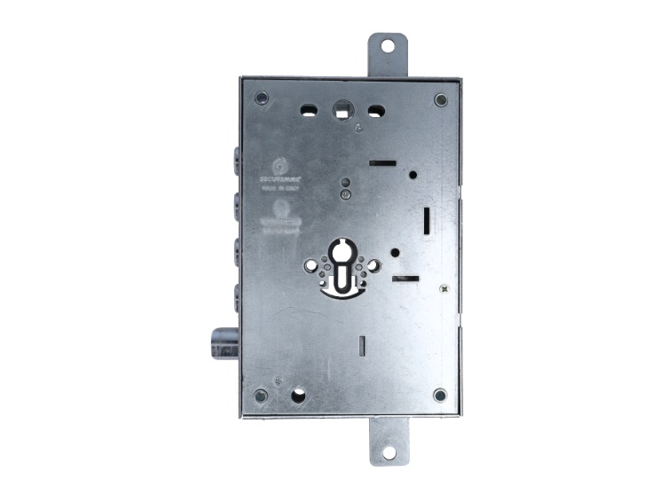 Cerradura para embutir en puertas acorazadas de la marca Securemme de 3 puntos de cierre. CUERPO CENTRAL, 4 BULONES, 200X135