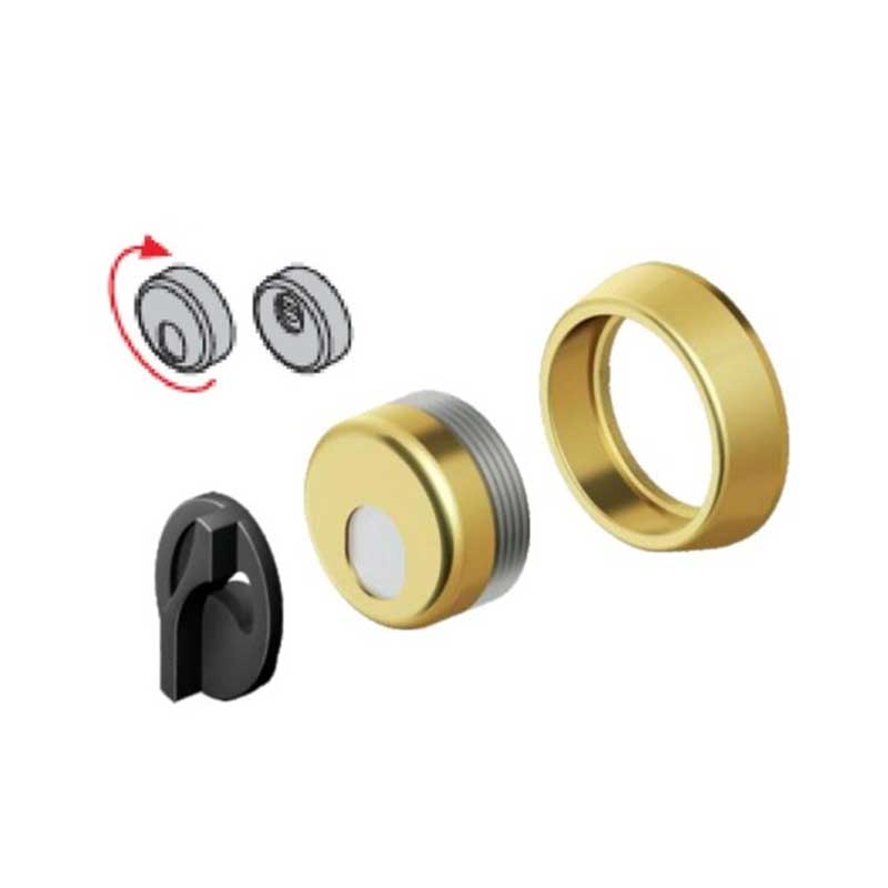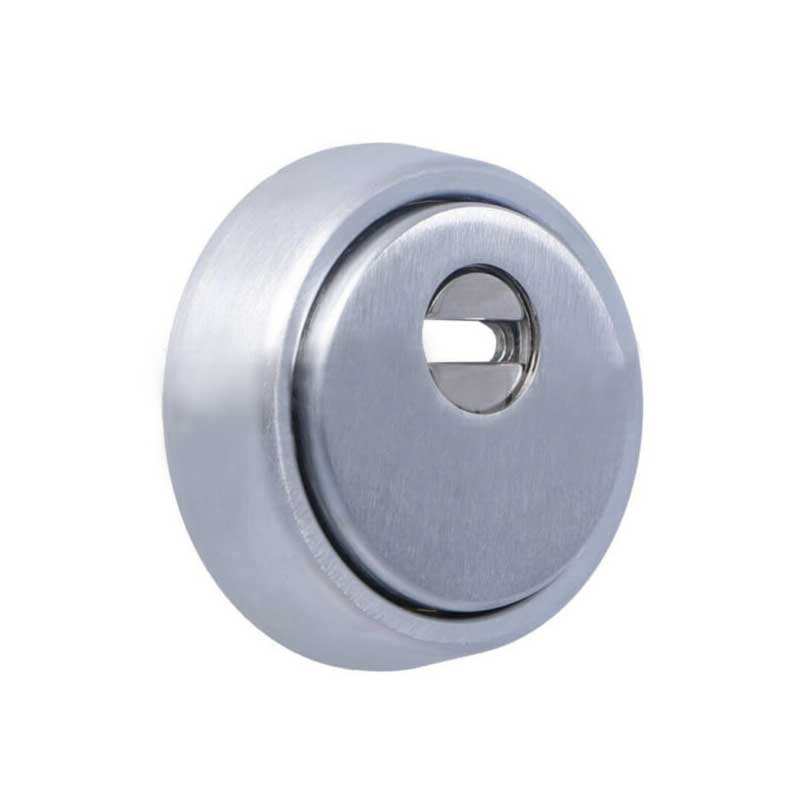 - En la instalación, el núcleo del escudo gira sobre el aro exterior para meterlo o sacarlo para ajustarlo a la medida adecuada al bombín. Este giro del núcleo para la regulación es suave y tiene un tope que no debe forzarse. Si lo forzamos y sobrepasamos el tope, el núcleo puede seguir entrando pero de ese modo se estropeará el escudo.
